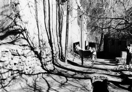 ユネスコに整備してもらったという道。冬の光が木々にあったて長い影を作っていた。まもなくすると馬を世話するために花柄のスカーフを付けた老婆がやって来た。