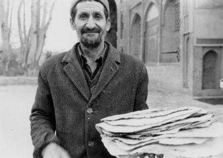 イラン人の主食は、彼が持っているナン。これに肉や野菜の焼いた物を巻いて食べる。町の一角の小さな店先にはナンを買う人々が集まっている。