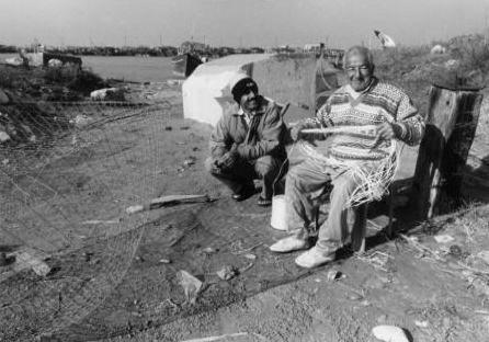ペルシャ湾にあるブーシャフルの漁港にて。 ダウ船が港には数多く泊まっていた。右はキャプテンと言われていた男。漁師達が網を修復していた。